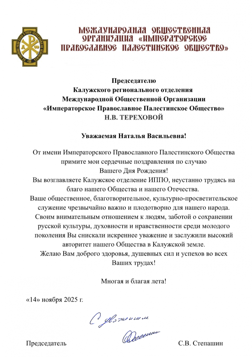 Председатель ИППО Сергей Степашин поздравил с днём рождения руководителя Калужского отделения Общества Наталью Терехову