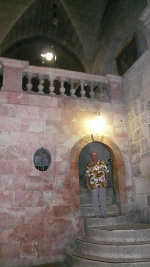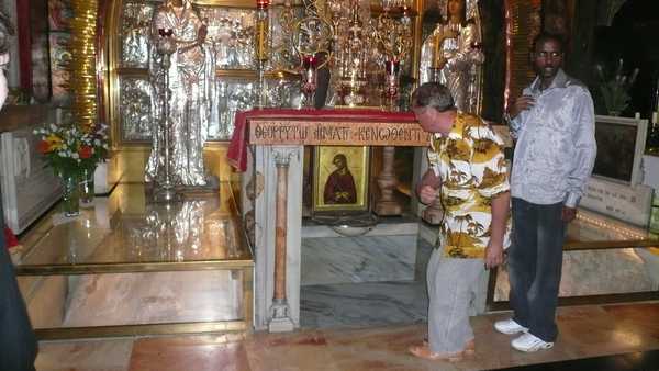 Мы входим в Храм Гроба Господня, справа у входа наверх ведут две крутые лестницы на Голгофу. Поднявшись, мы попадаем на место, где стоял крест, на котором был распят Христос. В глубине высится Распятие над открытым престолом. Под престолом в полу помещен серебряный диск с отверстием в середине, обозначающим место, куда был вставлен крест с распятым Иисусом. Мы поклонились месту Распятия, почувствовали эту печаль и горе здесь, на Голгофе, побывав на месте наибольших, крестных, страданий.