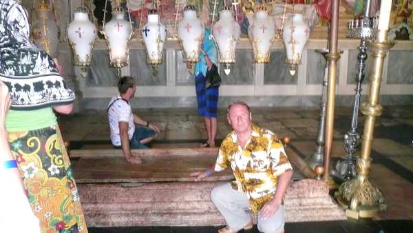 Спустившись вниз по лестнице, мы преклонились перед Камнем Миропомазанья. На этот камень, облицованный сейчас мрамором, было положено тело Христа, снятое с креста, для умащения ароматическими веществами перед погребением. Никогда мы не чувствовали такую близость к евангельской истории, как прикасаясь к Камню Миропомазанья.