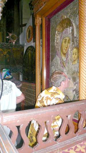 В нескольких метрах справа от спуска в Пещеру Рождества Христова, у стены, в деревянном киоте расположена Чудотворная Вифлеемская икона Пресвятой Богородицы. Вифлеемская икона Божией Матери была пожертвована в базилику Рождества Христова Русским Императорским домом. Риза ее изготовлена из платья преподобномученицы Елисаветы (великой княгини Елизаветы Феодоровны Романовой, 1864–1918 гг., председательницы Императорского Православного Палестинского Общества с 1905 по 1917 гг.). Эта икона особо отличительна тем, что это единственная из прославленных икон Божией Матери, на которой Пресвятая Дева изображена улыбающейся.