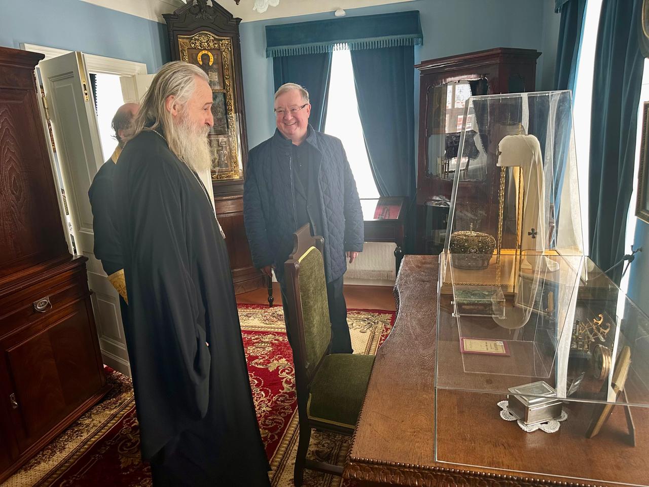 Также Председатель Общества в сопровождении настоятеля Обители в числе первых посетил отреставрированную мемориальную келью Патриарха Тихона в Донском монастыре. Это небольшая пристройка у северной стены монастыря, где после революции несколько лет под арестом жил Патриарх Тихон в полной изоляции от своей паствы. В келье представлены различные автографы Патриарха Тихона, его прижизненные фотографии, хроника обретения мощей. Среди экспонатов — погребальные литургические одежды, саккос и мантия, в которых были обретены мощи московского святителя.