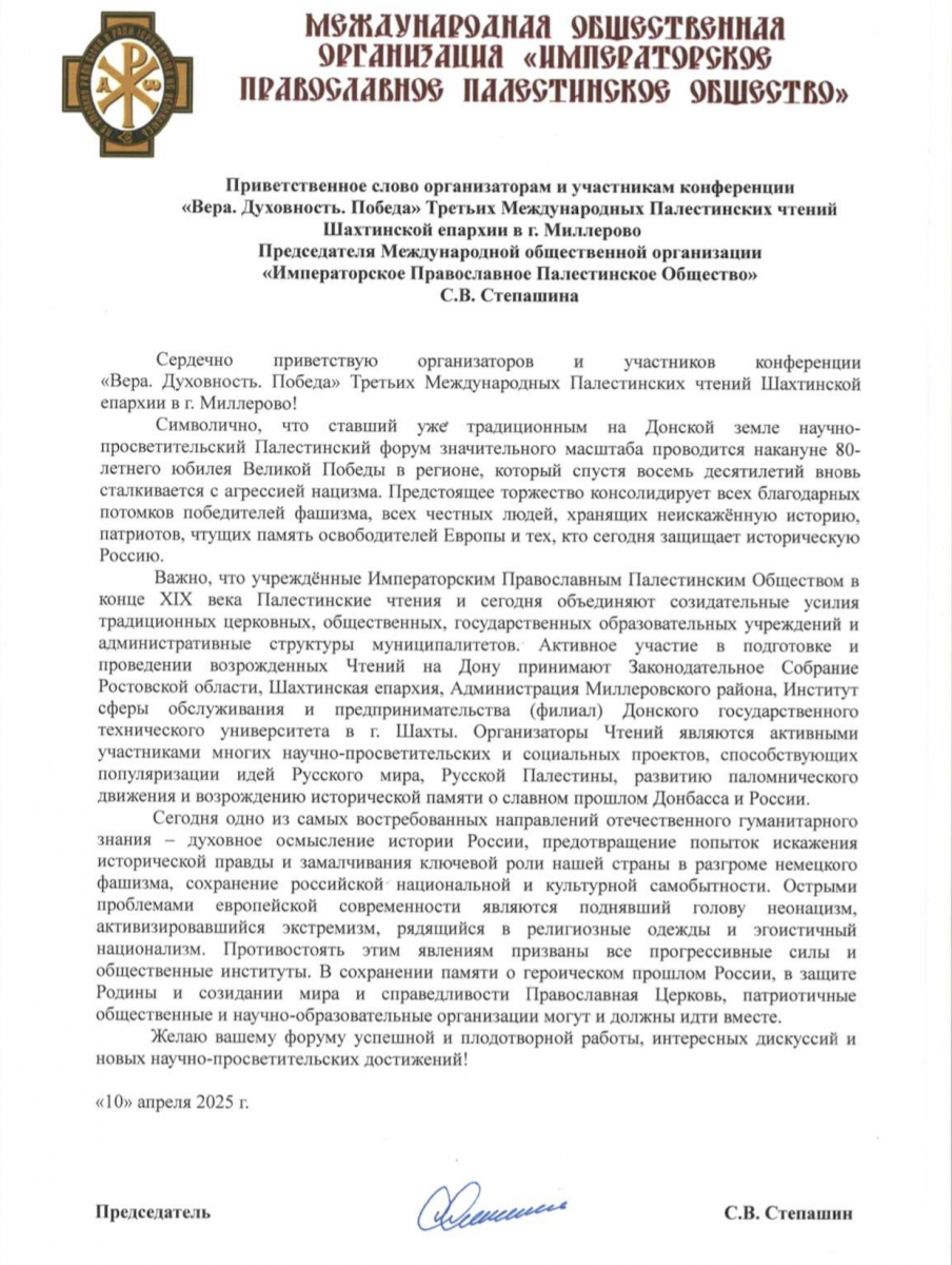 Ведущий зачитал приветственное слово Председателя ИППО Сергея Степашина. «Важно, что учреждённые ИППО в конце XIX века Палестинские чтения и сегодня объединяют созидательные усилия традиционных церковных, общественных, государственных образовательных учреждений и административные структуры муниципалитетов. Активное участие в подготовке и проведении возрожденных Чтений на Дону принимают Законодательное Собрание Ростовской области, Шахтинская епархия, Администрация Миллеровского района, Институт сферы обслуживания и предпринимательства (филиал) ДГТУ в Шахтах. Организаторы Чтений являются активными участниками многих научно-просветительских и социальных проектов, способствующих популяризации идей Русского мира, Русской Палестины, развитию паломнического движения и возрождению исторической памяти о славном прошлом Донбасса и России», – отметил в своём приветствии Сергей Вадимович.