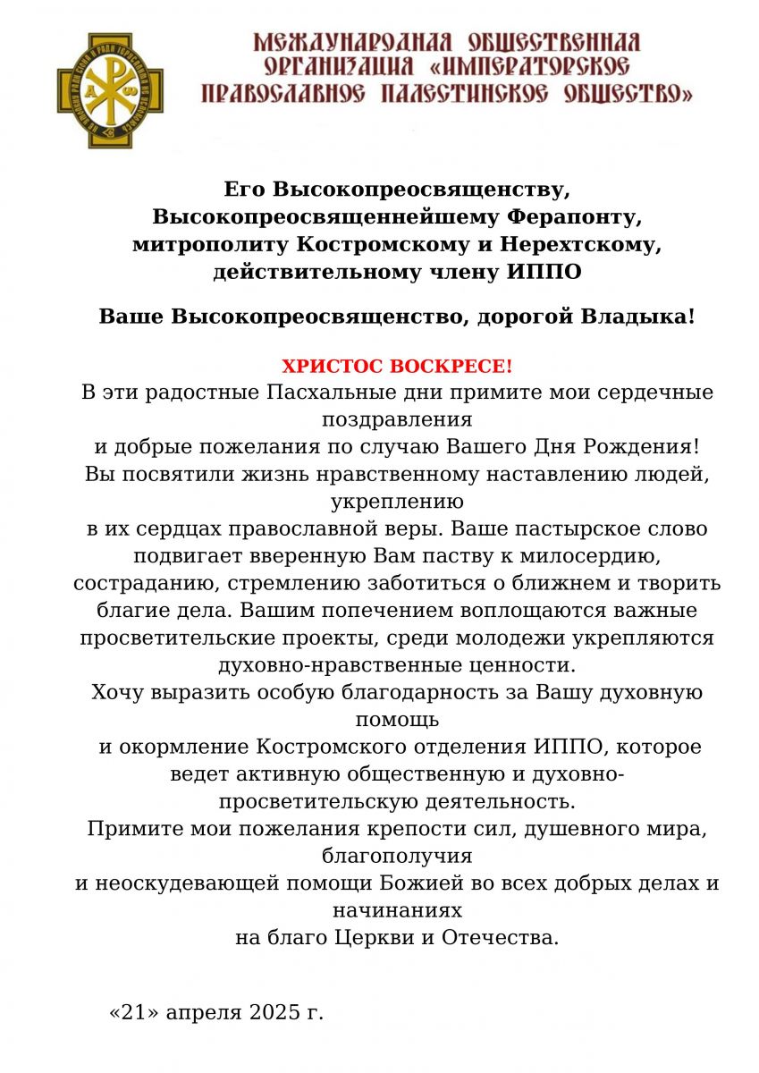 21 апреля день рождения отметил действительный член ИППО, митрополит Костромской и Нерехтский Ферапонт.