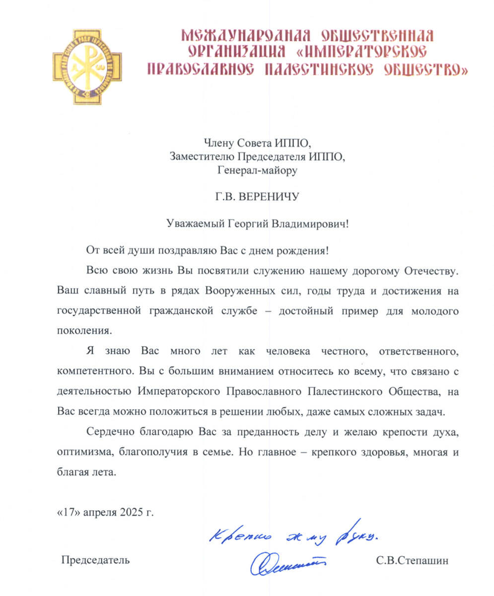 17 апреля Председатель ИППО Сергей Степашин поздравил с днем рождения заместителя Председателя Общества Георгия Владимировича Веренича.