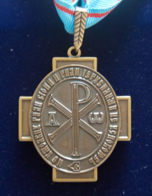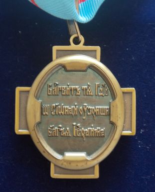Для почетных членов был установлен золотой греческий крест, сверху щит, посредине которого, на белом эмалевом фоне, золотая монограмма Христа между греческими буквами Альфа и Омега; кругом щита, на черной эмалевой ленте, надпись: «Не умолкну ради Cионa и ради Иepycaлима не успокоюсь». На обороте щита, на белом эмалевом фоне надпись: «Благословит тя Господь от Сиона и узриши благая Иерусалима». Для действительных членов — такой же знак серебряный без эмали. Для членов-сотрудников — такой же знак темной бронзы без эмали. Bсе три знака носятся на шее, на голубой с двумя узкими красными каемками лентах.