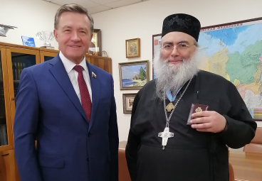 Член Совета ИППО Сергей Рябухин вручил удостоверение члена Общества настоятелю Михайло-Архангельского мужского монастыря игумену Афанасию (Селичеву)