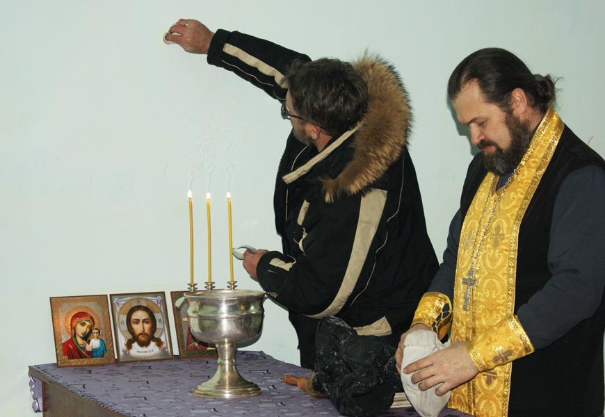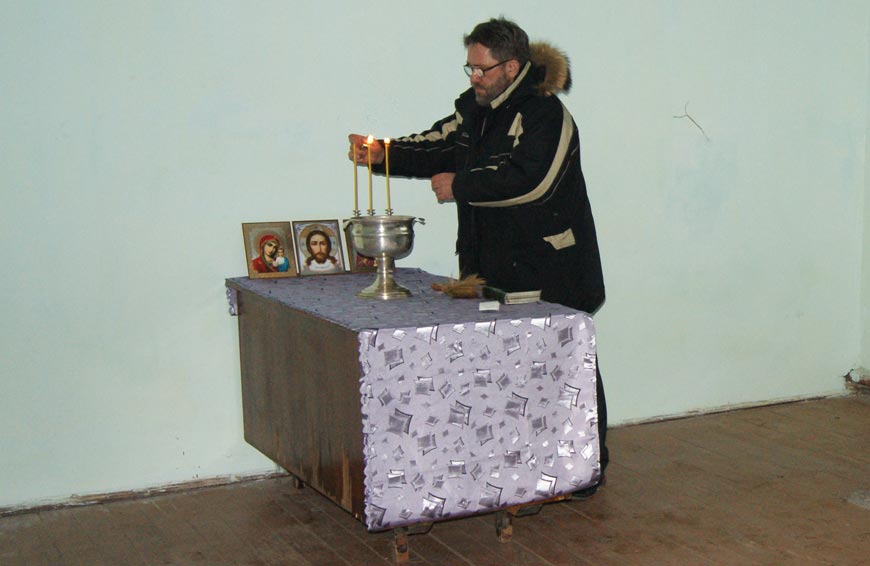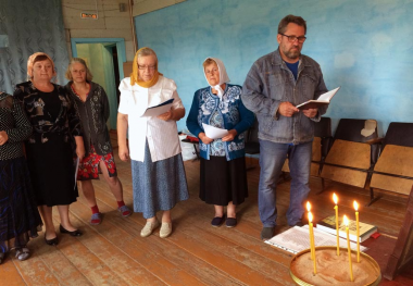 На первый молебен собрались жителя села с детьми, на котором также присутствовали помощник благочинного, член ИППО С.В. Мякишев и член ИППО Т.А. Мякишева. Они привезли в дар иконы от жителей села Бородино.