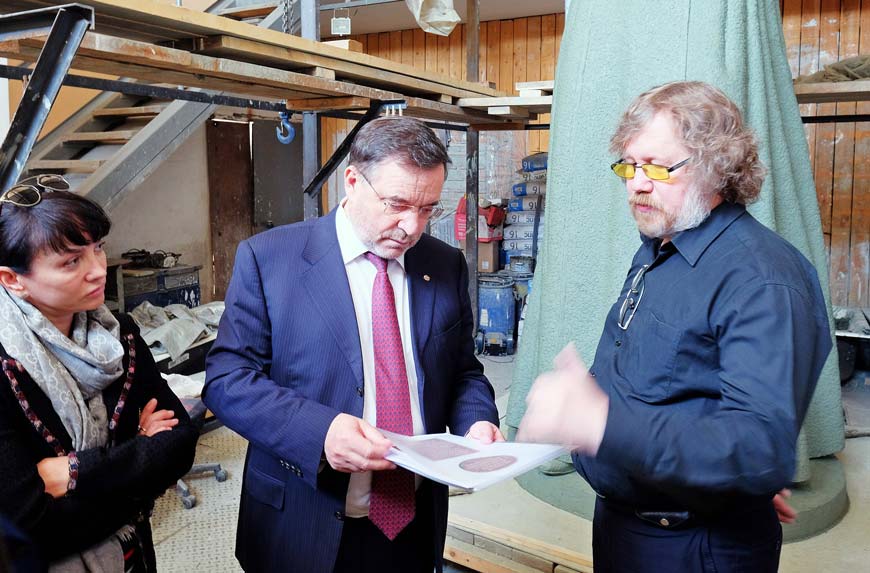 В минувшую среду происходило утверждение очередного этапа работ. Автор памятника, уральский скульптор Александр Кокотеев, представил полноразмерную фигуру высотой 3,5 метра, выполненную из глины.