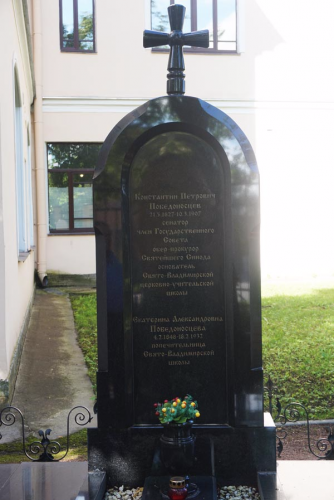 К. П. Победоносцев скончался 10 марта 1907 года и был погребён напротив алтаря домового Свято-Введенского храма основанной им Свято-Владимирской церковно-учительской школы рядом с Воскресенским Новодевичьим женским монастырём.