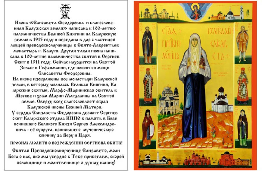 Также из Свято-Лаврентьевского монастыря по ходатайству епископа Козельского и Людиновского Никиты и по благословению митрополита Калужского и Боровского Климента из Калуги в Козельск была доставлена икона Елисавета Феодоровна и Благословенная Калужская Земля. Икона была создана трудами Калужского отделения в 2015 году к 100-летию паломничества Великой княгини Елисаветы Феодоровны на Калужскую землю и передана в дар Свято-Лаврентьевскому монастырю. Вместе с иконой доставили частицу мощей преподобномученицы, привезённую из Святой Земли, где покоятся мощи Великой княгини в храме святой Марии Магдалины в Гефсимании. Икона для участия в крестном ходе была доставлена в Козельск не случайно. Великая княгиня Елисавета Феодоровна в 1914 году посещала Козельск и совершала паломничество в Оптину Пустынь. Сопровождал икону представитель Калужской епархии протоиерей Максим (Немыченков).