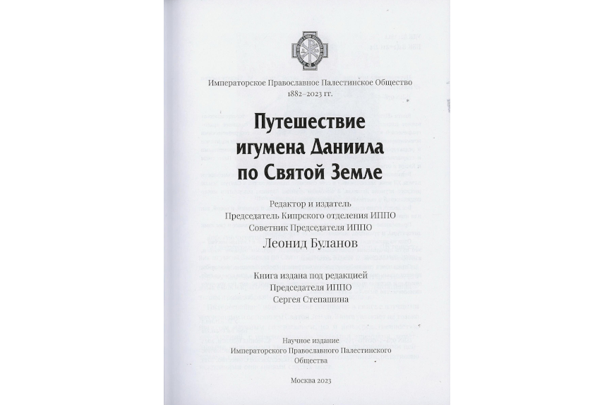 В книге «Путешествие игумена Даниила по Святой Земле» редактора и издателя, руководителя Кипрского отделения ИППО Леонида Буланова представлено вступительное слово Председателя Императорского Православного Палестинского Общества, Председателя редакционного совета книги Сергея Степашина.