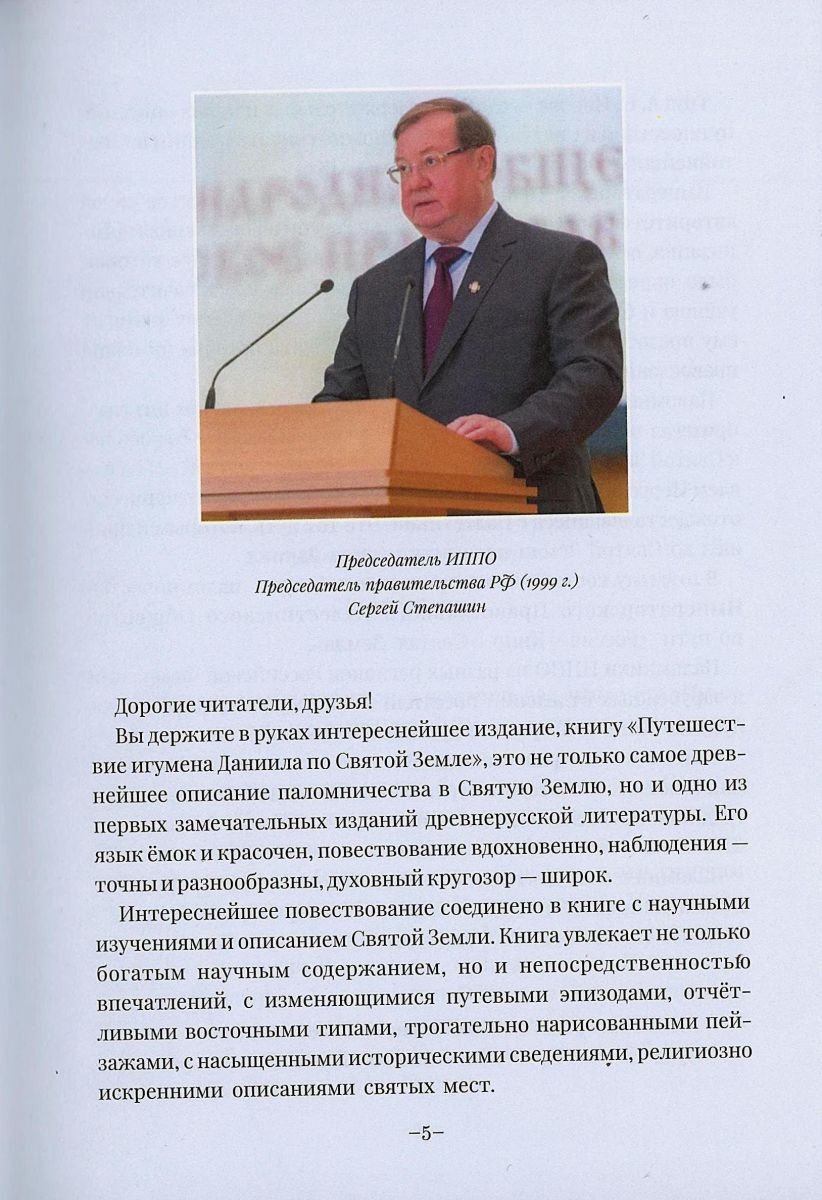 В своей вступительной статье Сергей Вадимович отмечает, что книга «Путешествие игумена Даниила по Святой Земле» — памятник древнерусской литературы, соединяет в себе научные изучения и красочные, религиозно искренние описания святых мест, также Сергей Степашин подчеркнул, что путь, пройденный игуменом Даниилом, косвенно связан с проведенным историческим событием Императорского Православного Палестинского Общества, открытия паломнического пути Россия-Кипр-Святая Земля в 2019 году.