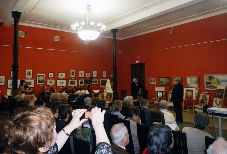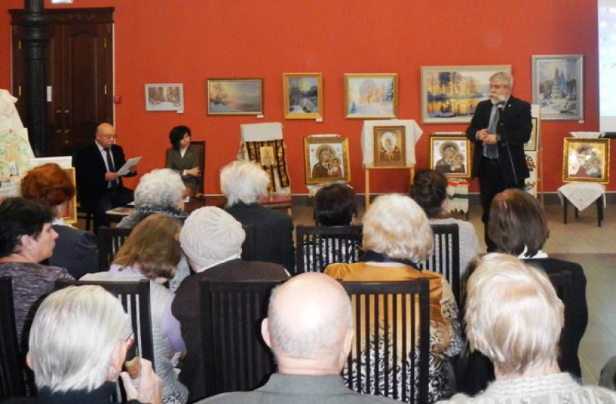 На Круглом столе были представлены вышитые иконы, привезённые на время выставки из воссозданного Ахлебининского Храма, в котором в этом году возобновились богослужения.