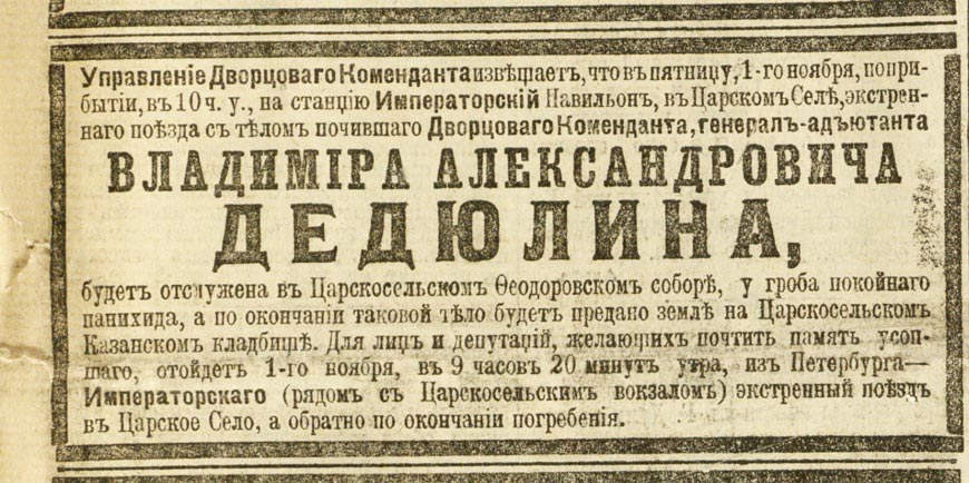 1 ноября 1913 года на Царскосельском Казанском кладбище состоялось погребение Дворцового коменданта, генерал-адъютанта и генерала от кавалерии В. А. Дедюлина. Отпевание тела покойного состоялось в Феодоровском соборе Царского Села. Служение панихиды возглавил протоиерей, духовник Их Императорских Величеств Николай Григорьевич Кедринский.