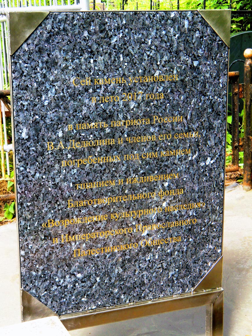 Сей камень установлен в лето 2017 года в память патриота России В. А. Дедюлина и членов его семьи, погребённых под сим камнем тщанием и иждивением благотворительного фонда «Возрождение культурного наследия» и Императорского Православного Палестинского Общества».