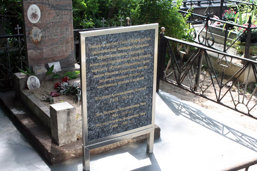 На могиле установлена памятная гранитная плита с надписями: «Генерал-адъютант, Санкт-Петербургский градоначальник, командир Отдельного корпуса жандармов, дворцовый комендант, покровитель «Союза русского народа» и «Русского Народного Союза имени Михаила Архангела», кавалер различных высоких русских и иностранных орденов и медалей Владимир Александрович Дедюлин (1858–1913 гг.). Дочь Екатерина Владимировна Эксе (1884–1976 гг.). Внучка Елизавета Дмитриевна Эксе (1906–1989 гг.).