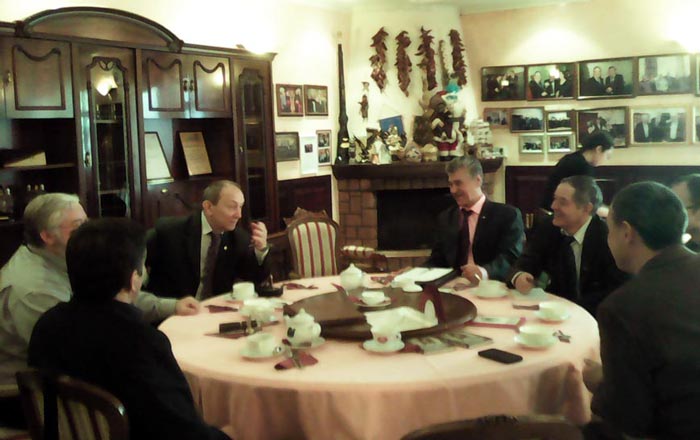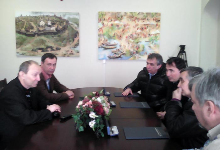 На фото: Михаил Калинин с директором Института Востоковедения Казанского федерального университета Рамилем Хайрутдиновым и директором Института археологии Академии наук Республики Татарстан Айратом Ситдиковым во время проведения переговоров.