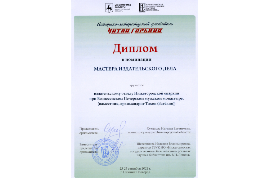 В рамках историко-литературного фестиваля издательский отдел Нижегородской епархии при Вознесенском Печерском монастыре под руководством заместителя руководителя регионального отделения ИППО получил диплом в номинации «Мастера издательского дела»