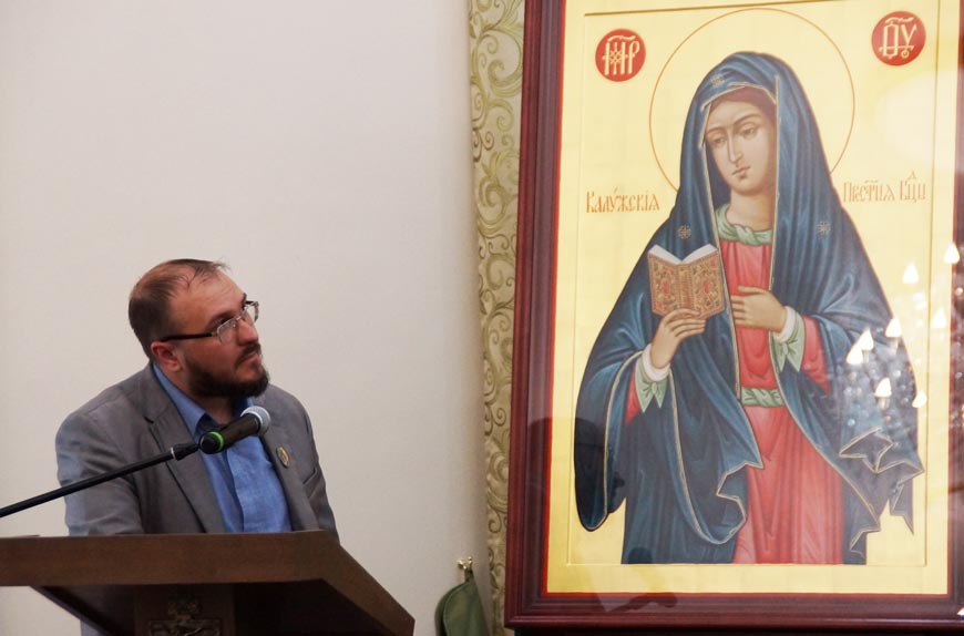 Председатель Калужского отделения ИППО Виталий Гороховатский выступил с докладом «Духовные скрепы России»: о системе духовно-просветительских, социокультурных и патриотических паломнических маршрутов по святыням благословенной Калужской земли.