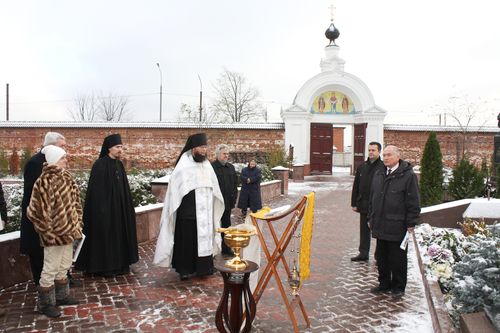 После торжественного вступления игумен Евмений (Лагутин) совершил у памятника водосвятный молебен и освятил его.
