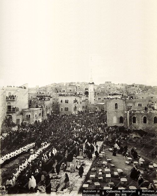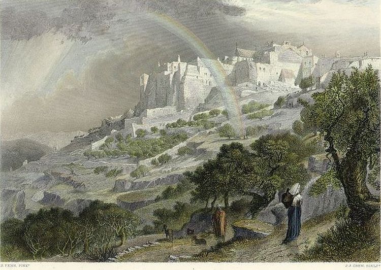 «После обеда на русском подворье проводник Марко прошел по номерам, объявив, что скоро будут готовы лошади для поездки в Вифлеем, который находится в 8 верстах от Иерусалима. В пятом часу длинная кавалькада экипажей двинулась на юг. По дороге несколько раз останавливались, посещая достопримечательности библейских времен. Наконец, впереди показался священный город Вифлеем, утопающий в зелени маслин, смоковниц, гранат и виноградников…»