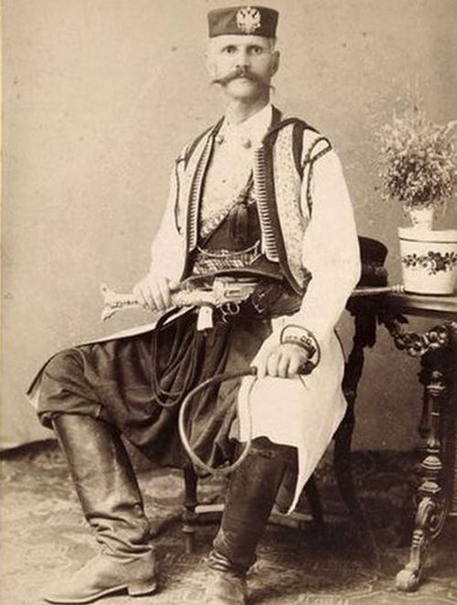 Давайте посмотрим на фотографию Марко внимательнее. Головной убор, по-черногорски «капа» или «завратка», украшен двуглавым царским орлом Российской империи. На белый кафтан одет верхний расшитый жилет «елек». На рубаху под кафтан надевался жилет «джамадан». Седельные пистолеты «леденицы» тоже были принадлежностью национального костюма, но у Марко оружие не украшение, а всегда готово к бою, по краям верхнего жилета устроены гнезда для патронов. Подпоясан Марко цветным широким поясом, называемым по-черногорски «силав». Вот такая колоритная фигура, гарцуя на белом коне, зорко охраняла безопасность паломнических караванов Палестинского Общества. Кстати, фотография сделана в Иерусалиме в фотоателье Гарабеда Крикорьяна, фотографа Армянского квартала, который в свое время обучался у самого Исайя Гаребедьяна, Армянского патриарха в Иерусалиме, основавшего в 60-е годы 19-го  века  в Старом городе первую фотошколу.