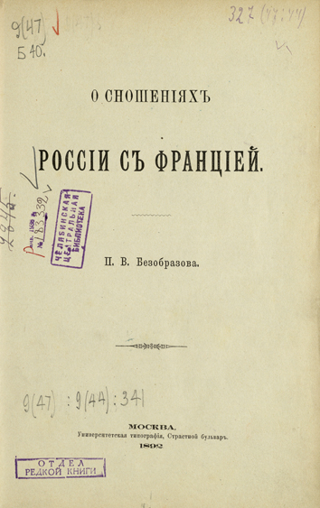 1. Безобразов, Павел Владимирович (1859–1918). О сношениях России с Францией / [Соч.] П.В. Безобразова. – Москва : Унив. тип., 1892. – , 465, II с.