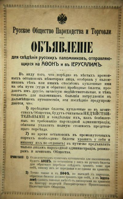 Для того чтобы паломники заранее имели представление о той сумме, которую им предстояло потратить на поездку, газеты от имени Палестинского общества публиковали сведения о стоимости проезда в Иерусалим и на Афон из Петербурга, Москвы, Воронежа, Казани, Киева, Курска, Пензы, Рязани, Самары, Саратова, Тулы, Уфы и др. городов.