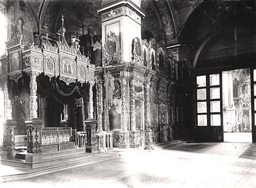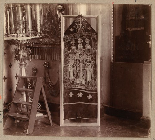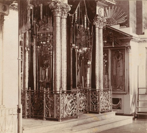 Затем великая княгиня изволила обозревать собор, его древности и святыни. Относительно самого собора, имеющего величественный вид, сравнительно богато и довольно изящно обставленного и украшенного, Ее Высочество восхищенно сказала: „Прекрасный собор!“ Великая княгиня обратила особое внимание на шитый шелками покров, сработанный руками царевен – сестер царя Алексия Михайловича, являющийся ныне вещественным и нелицеприятным свидетельством того, что прещение на имя благоверной княгини действительно было наложено из-за перстосложения. Царевны на этом покрове правую руку благоверной княгини Анны вышили с двуперстным сложением, но руку с таким перстосложением, очевидно позднее, закрыли твердо пришитою сверху новой дланью, на которой пальцы сложены уже триперстно. Эта подробность выяснилась незадолго до праздника, при оправлении покрова и внимательном его рассмотрении. Старообрядцы просили высокопреосвященного Алексия снять нашитую десницу, что он и разрешил сделать.