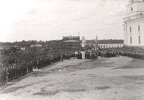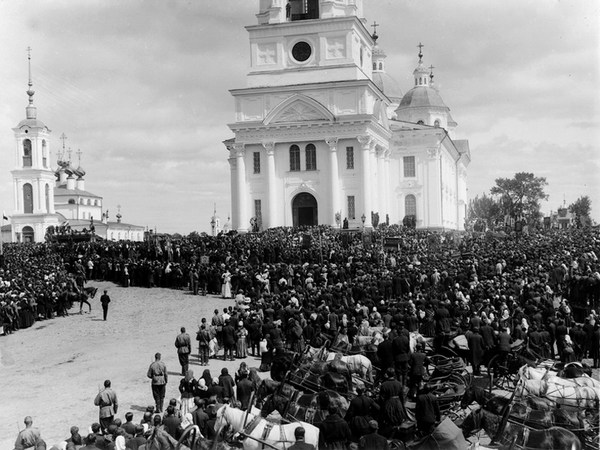 На соборную площадь еще с раннего утра начал стекаться народ. Громадные толпы народа запрудили не только площадь, но и примыкающую к ней думскую улицу. На пространстве, ими занимаемом, безбрежное море голов, волнующееся, переливающееся, сверкающее разными цветами и красками. Толпы стоят в ожидании величавой процессии.