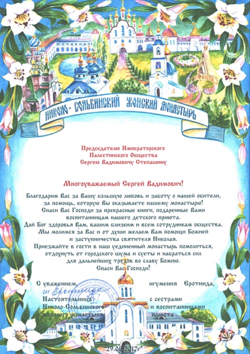 Настоятельница Николо-Сольбинского женского монастыря игумения Ератиида выразила благодарность Сергею Степашину за любовь и заботу об обители, за постоянную помощь монастырю со стороны Императорского Православного Палестинского Общества.