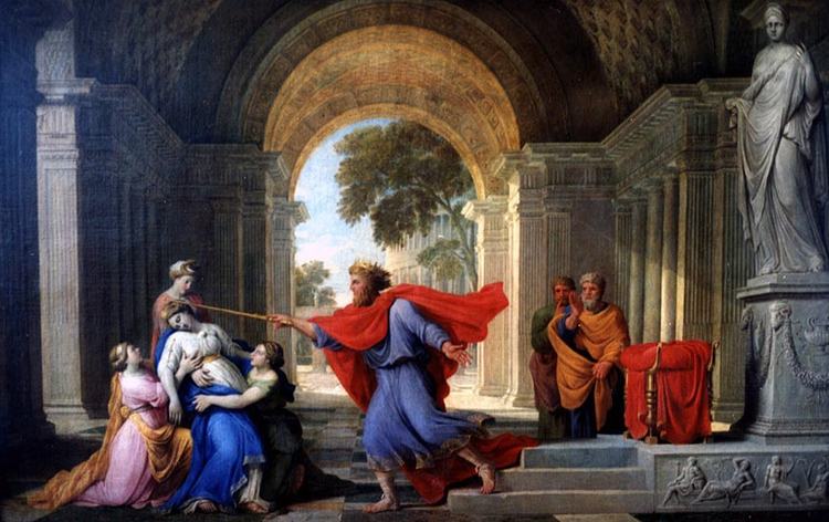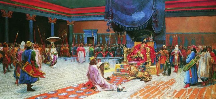 Сюжет "Эсфирь перед Артаксерксом" отражает библейскую историю, рассказывающую о том, как жена персидского царя Артаксеркса Эсфирь, о чьем иудейском происхождении царь не знал, пришла к повелителю в лучших одеждах во всем блеске своей красоты без приглашения, чтобы просить его не истреблять народ иудейский. Царь сидел на троне и грозно посмотрел на свою жену, посмевшую явиться к нему без зова. Эсфирь от страха потеряла сознание, царь бросился к ней и коснулся ее своим жезлом, что означало ее неприкосновенность и милость от царя. Когда царица поведала о своем происхождении из пленных евреев, переселенных с родины еще вавилонским царем Навуходоносором и высказала свою просьбу о помиловании иудейского народа, Артаксеркс не только подписал указ о помиловании евреев во всем обширном царстве, но и разрешил им расправиться со своими врагами. Евреи ликовали и умертвили семьдесят пять тысяч человек, убивая целыми семьями. В память о подвига Эсфири, спасшей свой народ, был установлен праздник Пурим.