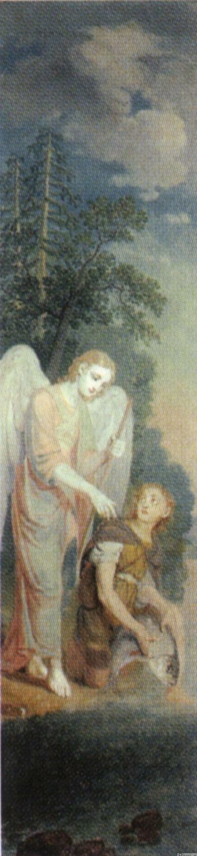 Товия прежде всего стал искать спутника для своего путешествия и встретил архангела Рафаила, который согласился сопровождать его. (Товия принял ангела за обычного смертного. Отличительный признак ангела — крылья — были позднехристианской условностью, заимствованной у римского античного образа крылатой богини Победы.)