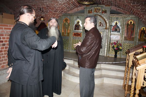 Настоятель игумен Евмений рассказал отцу Тихону о монастырской аптеке трав, берлюковском винограде, монастырской пасеке и восстановительных работах, которые сейчас проходят на территории монастыря. Во время экскурсии по монастырю архимандрита Тихона заинтересовал уникальный чугунный вызолоченный иконостас, изготовленный на Каслинском заводе в 1861–1864 годах и установленный в пещерном Иоанно-Предтеченском скиту.