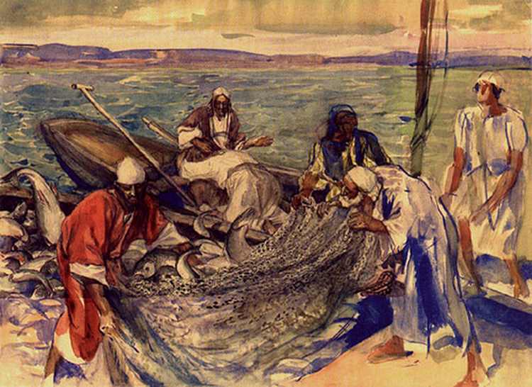 Однажды, когда народ теснился к Нему, чтобы слышать слово Божие, а Он стоял у озера Геннисаретского, увидел Он две лодки, стоящие на озере; а рыболовы, выйдя из них, вымывали сети. Войдя в одну лодку, которая была Симонова, Он просил его отплыть несколько от берега и, сев, учил народ из лодки. Когда же перестал учить, сказал Симону: отплыви на глубину и закиньте сети свои для лова. Симон сказал Ему в ответ: Наставник! мы трудились всю ночь и ничего не поймали, но по слову Твоему закину сеть. Сделав это, они поймали великое множество рыбы, и даже сеть у них прорывалась. И дали знак товарищам, находившимся на другой лодке, чтобы пришли помочь им; и пришли, и наполнили обе лодки, так что они начинали тонуть. Увидев это, Симон Петр припал к коленям Иисуса и сказал: выйди от меня, Господи! потому что я человек грешный. Ибо ужас объял его и всех, бывших с ним, от этого лова рыб, ими пойманных; также и Иакова и Иоанна, сыновей Зеведеевых, бывших товарищами Симону. И сказал Симону Иисус: не бойся; отныне будешь ловить человеков. И, вытащив обе лодки на берег, оставили всё и последовали за Ним. Лк. 5:1-11