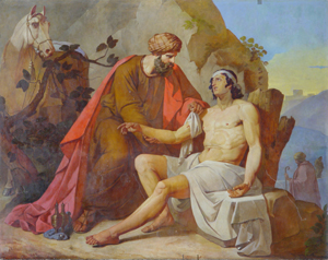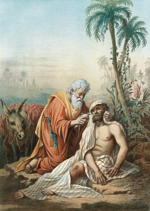 На это сказал Иисус: некоторый человек шел из Иерусалима в Иерихон и попался разбойникам, которые сняли с него одежду, изранили его и ушли, оставив его едва живым. По случаю один священник шел тою дорогою и, увидев его, прошел мимо. Также и левит, быв на том месте, подошел, посмотрел и прошел мимо. Самарянин же некто, проезжая, нашел на него и, увидев его, сжалился и, подойдя, перевязал ему раны, возливая масло и вино; и, посадив его на своего осла, привез его в гостиницу и позаботился о нем; а на другой день, отъезжая, вынул два динария, дал содержателю гостиницы и сказал ему: позаботься о нем; и если издержишь что более, я, когда возвращусь, отдам тебе. Кто из этих троих, думаешь ты, был ближний попавшемуся разбойникам?