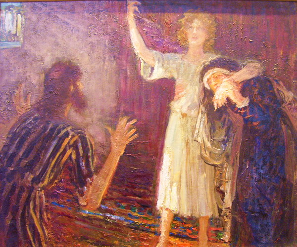 Не то у Репина, давшего новое, небывалое, смелое решение. У него действие происходит у самого склепа. Магдалина, по мысли художника, пошла на рассвете к дорогой для нее гробнице и тут-то и натолкнулась на Христа, только что отвалившего камень и вышедшего на волю. Он еще весь укутан пеленами, движения его скованы, жесты не свободны, руки прижаты к телу.
