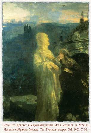 Первоначально его левая рука была еще более прижата к груди и следы ее ясно видны. Голова Магдалины писана с Веры, но черты лица значительно утончены и облагорожены. Взгляд чисто репинский, хорошо знакомый нам по мальчику в «Не ждали», по царевичу в «Иване Грозном», по юноше в «Николае Мирликийском», по раненому в «Дуэли». Этот экзальтированный взгляд у Магдалины излишне утрирован, да и глаз не сидит в орбите, что значительно снижает ценность картины. Очень удалось Репину предрассветное небо с ползущим по нему розовым облаком. Оно прекрасно наблюдено и передано жизненно.