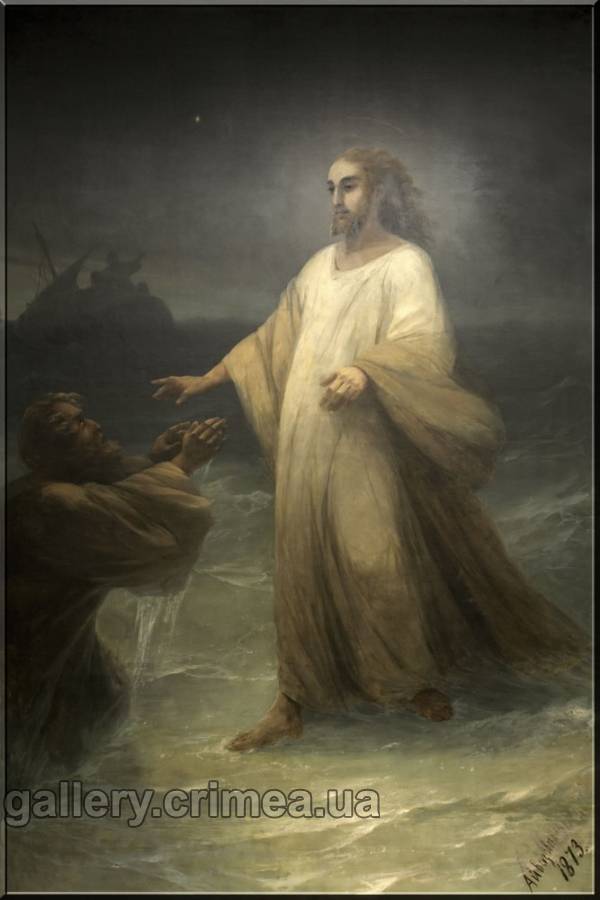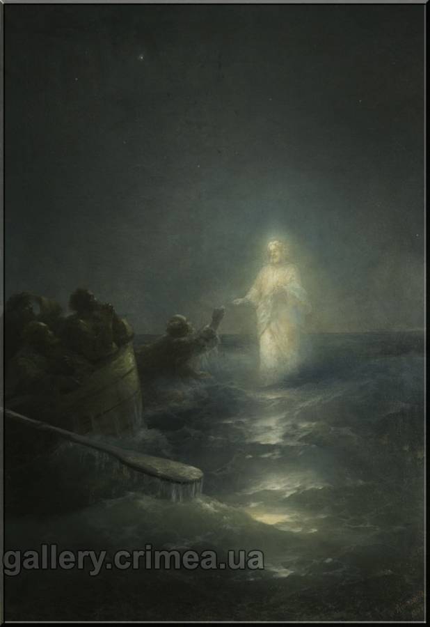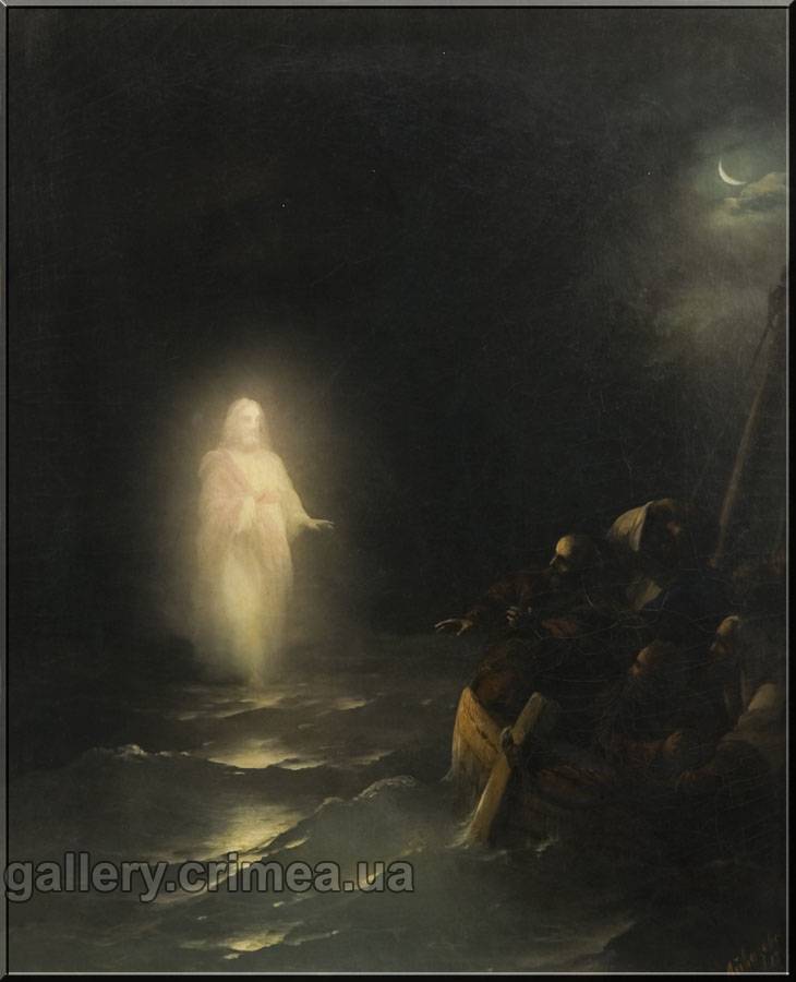 Фигура Христа помещена в левой части композиции, в результате чего явственно создается эффект движения. Учитель явился неожиданно, вдруг. Он словно стремительно плывет, приближаясь к испуганным апостолам «… и ученики, увидевши Его, идущего по морю, встревожились и говорили это призрак, и от страха вскричали» (Евангелие от Марка 6:49). Крымская художественная галерея