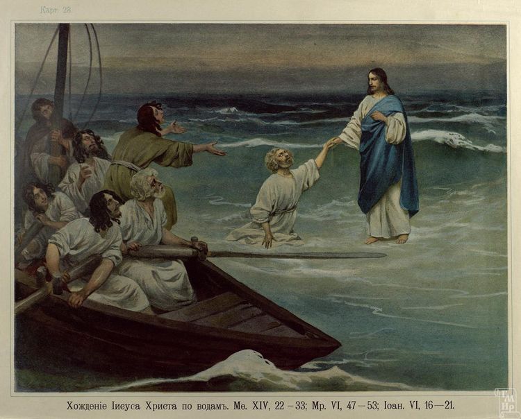 Отпустив народ, Он взошел на гору помолиться наедине; и вечером оставался там один. А лодка была уже на средине моря, и ее било волнами, потому что ветер был противный. В четвертую же стражу ночи пошел к ним Иисус, идя по морю. И ученики, увидев Его идущего по морю, встревожились и говорили: это призрак; и от страха вскричали. Но Иисус тотчас заговорил с ними и сказал: ободритесь; это Я, не бойтесь. Петр сказал Ему в ответ: Господи! если это Ты, повели мне придти к Тебе по воде. Он же сказал: иди. И, выйдя из лодки, Петр пошел по воде, чтобы подойти к Иисусу, но, видя сильный ветер, испугался и, начав утопать, закричал: Господи! спаси меня. Иисус тотчас простер руку, поддержал его и говорит ему: маловерный! зачем ты усомнился? И, когда вошли они в лодку, ветер утих. Бывшие же в лодке подошли, поклонились Ему и сказали: истинно Ты Сын Божий. Евангелие от Матфея, Мф. 14:22–36. См также: Мк. 6:45–56; Ин. 6:16–21.