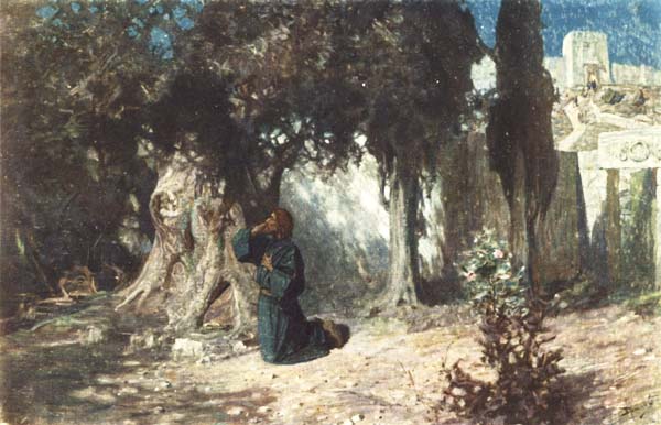 Картина относится к евангельской серии Поленова «Из жизни Христа» (1890—1900-е годы). Как и в большинстве работ из этой серии, образ Христа в Гефсиманском саду отличается от традиционной трактовки мотива, известного по сюжету «Моление о чаше». Христос, возносящий молитву под сенью старой кряжистой оливы в Гефсиманском саду, изображен стоя на коленях, устремившим взор к небу и поднявшим правую руку к лицу, а левую — прижавшим к груди. Справа вдалеке открывается вид на крепостные стены Иерусалима с ведущей к нему дорогой. Общее настроение картины как бы продиктовано словами из Евангелия: «Прискорбна душа Моя» (Мф. 26:38; Мк. 14:34). Эти евангельские слова были выбраны Поленовым для названия картины, под которым экспонировался один из вариантов на выставке «Из жизни Христа» в 1909—1910 гг. Известны авторские варианты-повторения на этот сюжет: работа под названием «Прискорбна душа Моя» упоминается в собрании Чарльза Крэна, США. (К. Николаев. Галерея на Карповке)
