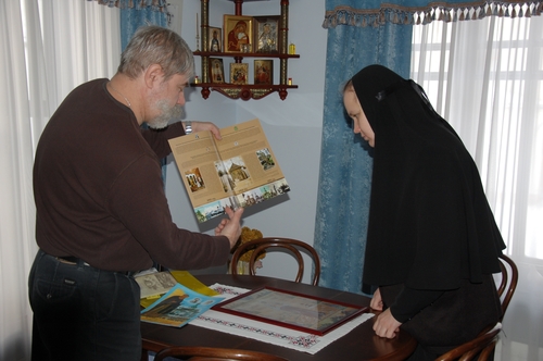Затем состоялась встреча председателя Калужского отделения ИППО Гороховатского В. Н.с настоятельницей монастыря инокиней Екатериной. Виталий Николаевич рассказал о Международном проекте Калужского отделения ИППО «Духовная связь: Калуга – Иерусалим» и передал в дар обители икону «Святая преподобномученица великая княгиня Елисавета Феодоровна и благословенная Калужская земля», а также документальный фильм «Святая Земля» о прошедшем в октябре-ноябре 2011 года в рамках проекта крестном ходе по монастырям Калужской земли и Святой Земли с иконой.