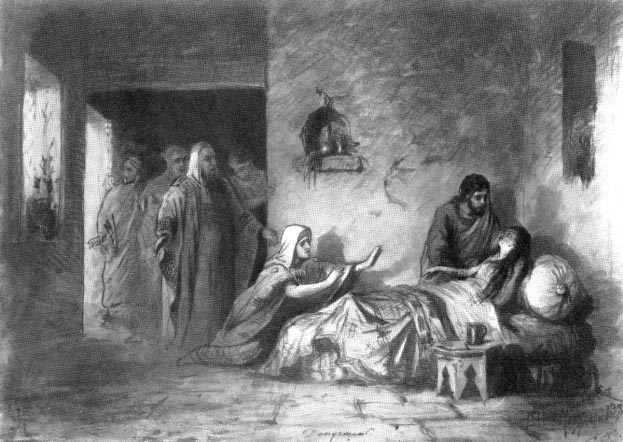 Академия художеств задала тему на известный евангельский сюжет: воскрешение дочери Иаира. Познакомиться с ним можно в трех синоптических Евангелиях. Наиболее подробно сюжет раскрыт в Евангелии от Марка (10 стихов): проповедуя и творя чудеса, Иисус Христос ходил по Галилее. И вот Он «возвратился из страны Гадаринской, а народ уже ждал Его частию ради учения, а частию ради чудес. Пришел и один начальник синагоги, ни бедный, ни отверженный, но из первых»[65]. Он просит исцелить его дочь, ей было двенадцать лет, и она была при смерти. Иисус согласился. Однако через некоторое время приходят люди от начальника синагоги и говорят ему, что девица умерла[66].