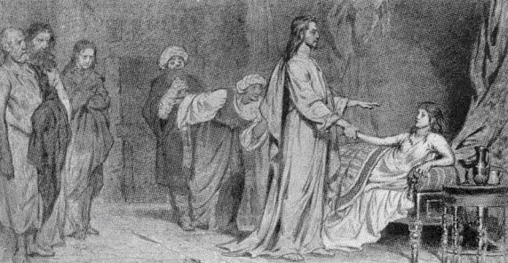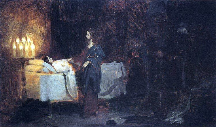 «(36) Но Иисус, услышав сии слова, тотчас говорит начальнику синагоги: не бойся, только веруй. (37) И не позволил никому следовать за Собою, кроме Петра, Иакова и Иоанна, брата Иакова. (38) Приходит в дом начальника синагоги и видит смятение, и плачущих и вопиющих громко. (39) И вошед говорит им: что смущаетесь и плачете? девица не умерла, но спит. (40) И смеялись над Ним. Но Он, выслав всех, берет с Собою отца и мать девицы и бывших с Ним и входит туда, где девица лежала. (41) И взяв девицу за руку, говорит ей: «талифа-куми», что значит: «девица, тебе говорю, встань». (42) И девица тотчас встала и начала ходить, ибо была лет двенадцати. Видевшие пришли в великое изумление. (43) И Он строго сказал им, чтобы никто об этом не знал, и сказал, чтобы дали ей есть». (Марк 5, 36-43)