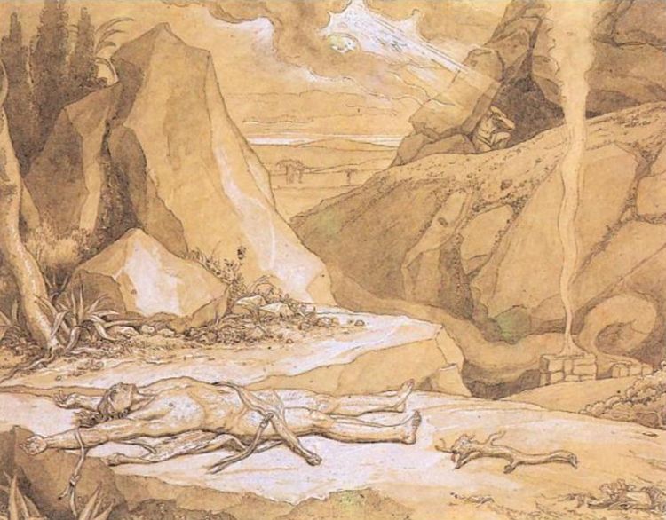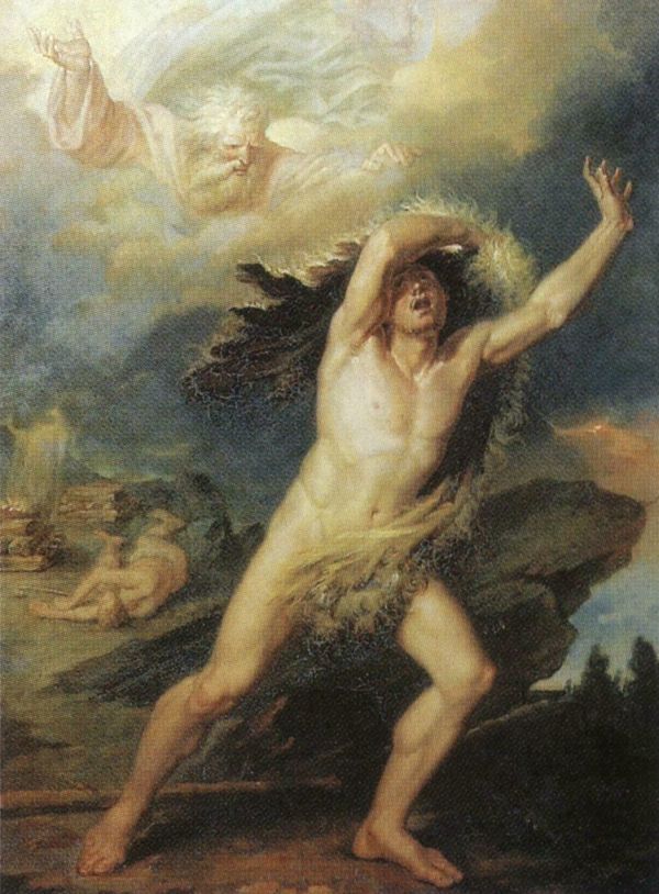 Каин, осуждаемый Господом за братоубийство и бегущий от гнева Божия.