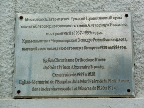 Памятная доска, установленная на стене Храма Александра Невского в Бизерте