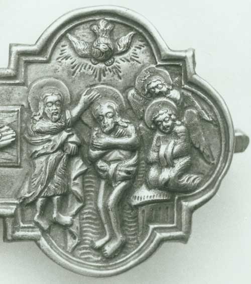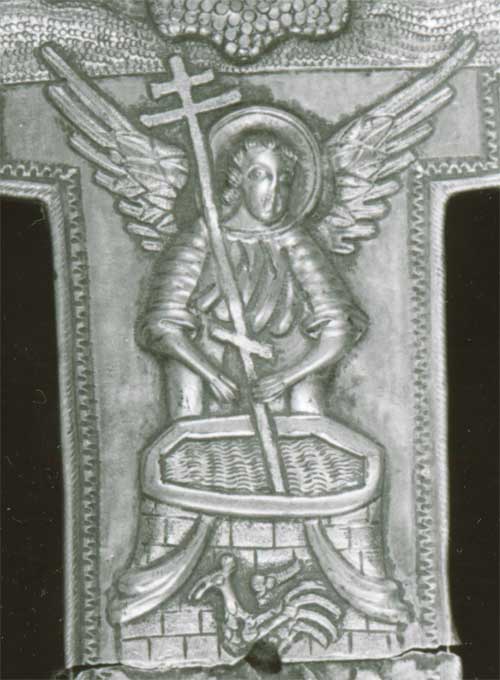 На другом кресте из собрания Костромского музея-заповедника [илл. 8][15] над Орудиями Страстей Христовых на лицевой стороне представлен Ангел, опустивший восьмиконечный крест в кладезь, что может являться наглядной иллюстрацией к тексту Евангелия от Иоанна (гл. 5), читаемого в храме при освящении воды: «Ибо Ангел Господень по временам сходил в купальню и возмущал воду, и кто первый входил в нее по возмущении воды, тот выздоравливал, какою бы ни был одержим болезнью». Таким образом, перед нами водосвятный крест середины XVIII века.