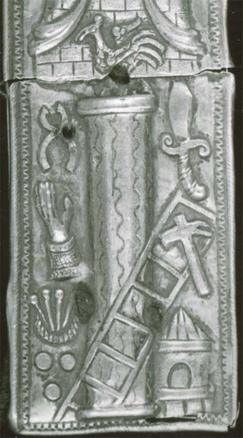 ![]() Илл.7. Крест напрестольный 1755 г. 38.5 × 21 см Костромской историко-архитектурный музей-заповедник, Кострома, Россия. Инв. КОК 22228 Ниже см. детали Фотографии и текстовые материалы предоставлены для публикации российским Ставрографическим центром. Литература: Гнутова 1994. Гнутова С. В. Орудия Страстей Христовых на русских крестах XVII–XIX веков // Филевские чтения. Вып. V / Материалы третьей научной конференции по проблемам русской культуры второй половины XVII — начала XVIII веков. — М., 1994. — Стр. 71. ![]() А. Орудия Страстей Христовых ![]() Орудия Страстей Христовых. Деталь напрестольного креста 1755 года (КОК 22228) |