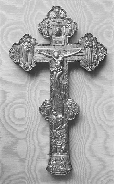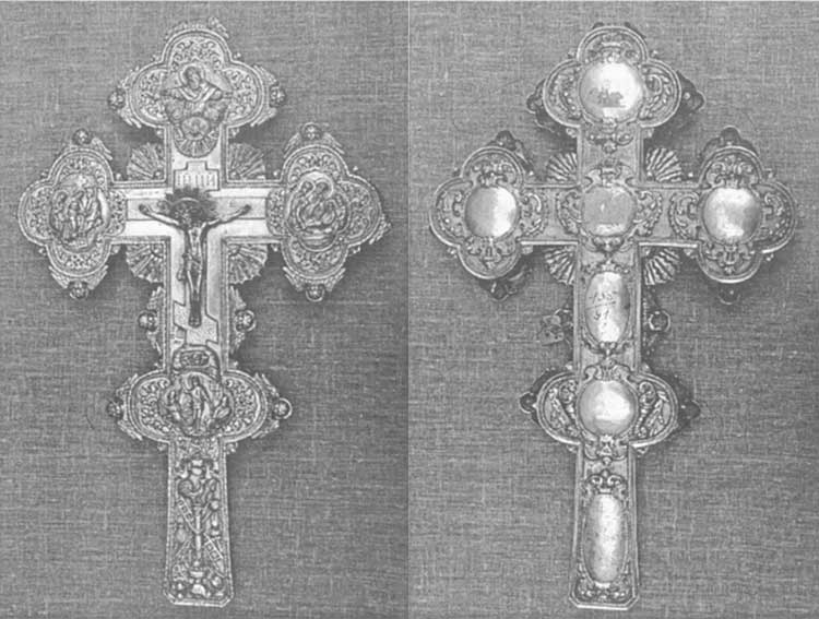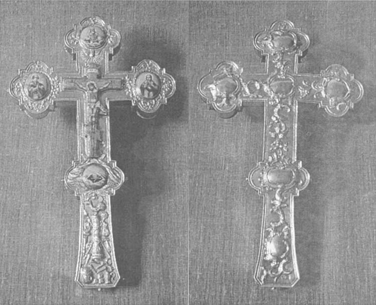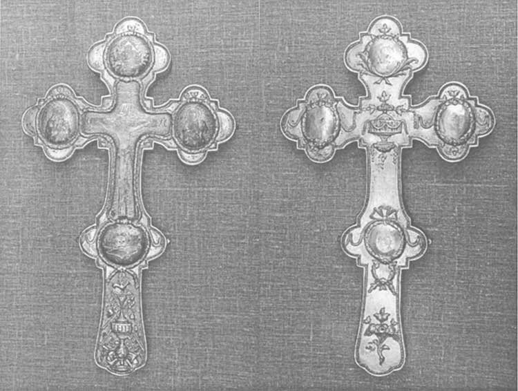 [12] ПГОИХАМЗ № 335, 336, 337. Крест 1768 г. мастера Ивана Фролова (Москва), 45,0×29,0 см. (№ 335); крест 1781 г. того же мастера, помимо чеканки дополнен эмалью, 40,2×25,0 см. (№ 336); крест последней четверти XVIII в. Москва, клеймо ИПМ. Серебро, резьба, чернь. (№ 337) [илл. 6]. За сведения об этих крестах приношу благодарность И. С. Родниковой.