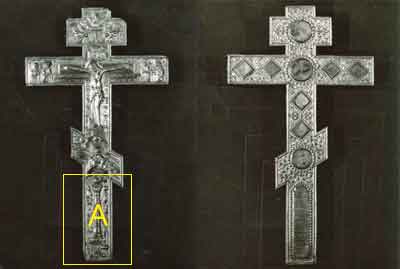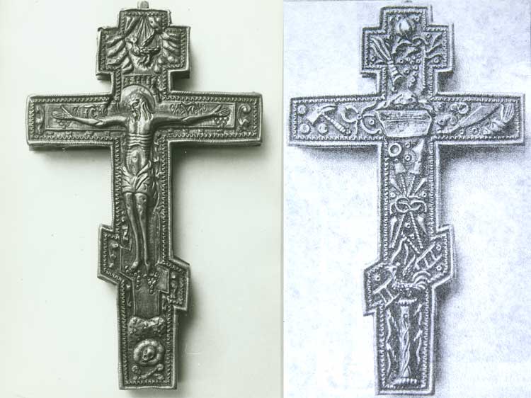 При сравнении этих крестов наиболее детальное воспроизведение Орудий Страстей Господних обнаруживается на псковском кресте 1718 года [илл. 1]. Его подробное описание помещено в описи Псковского Иоанно-Предтеченского монастыря: